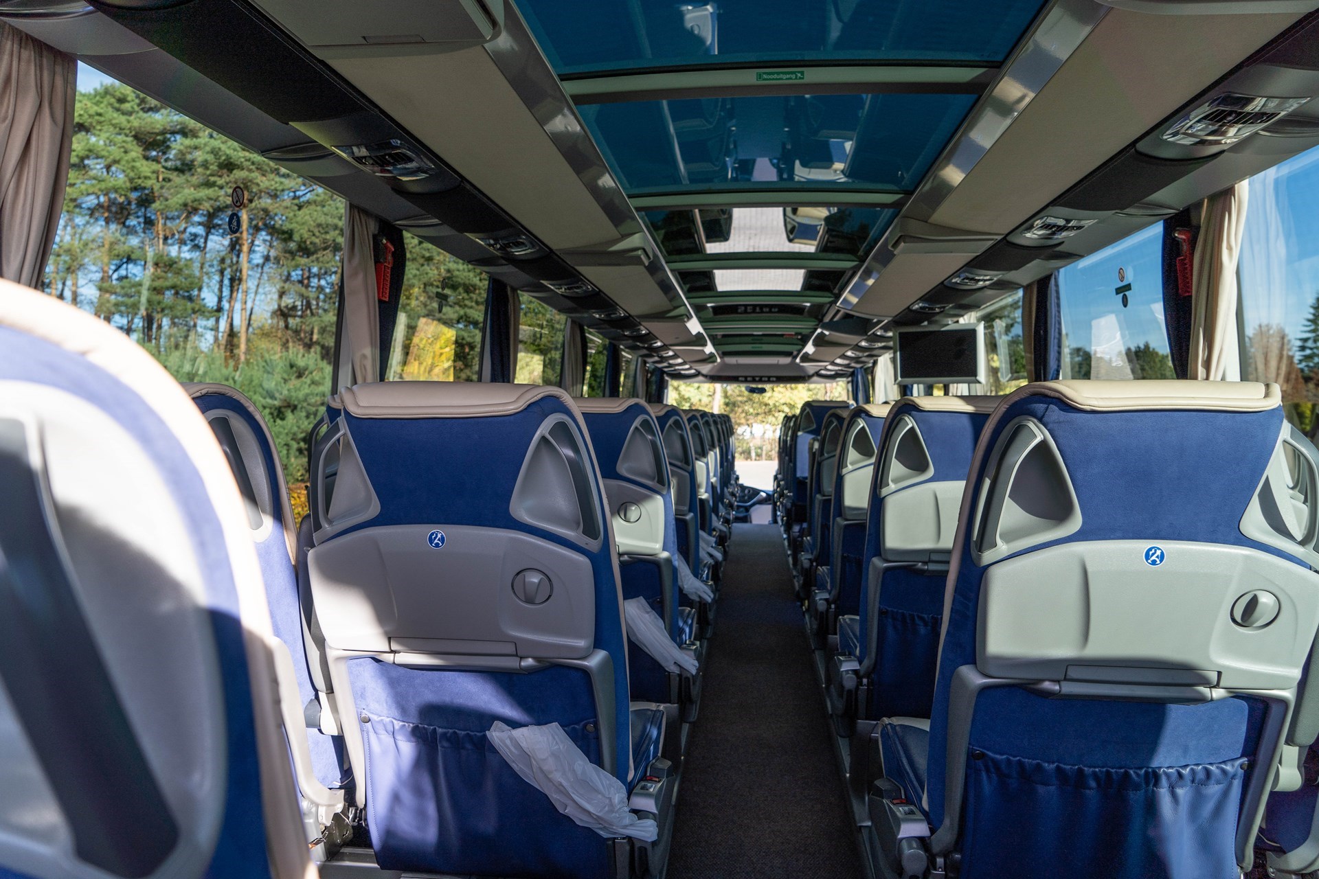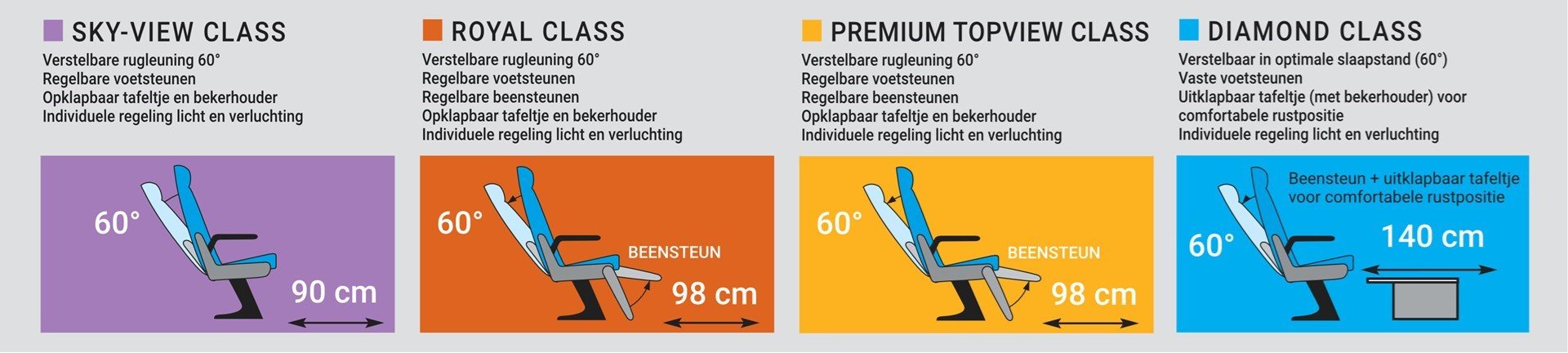 Dit is een nieuwe manier van reizen, onze Sky-View Class-autocars geven een andere dimensie aan comfort! Opgelet! Voor bepaalde reizen wordt onze Royal Class-autocar ingezet met 6 rijen vóór de trap en 5 rijen achter de trap. PANORAMISCH GLASDAK: loopt over de hele lengte van de autocar! MULTI-VISION SYSTEM: in dit type autocar heeft iedereen het gevoel op de eerste rij te zitten, dankzij een ‘WIDE VIEW CAMERA’ vooraan en verschillende LCD-schermpjes in de autocar... Absoluut topcomfort!